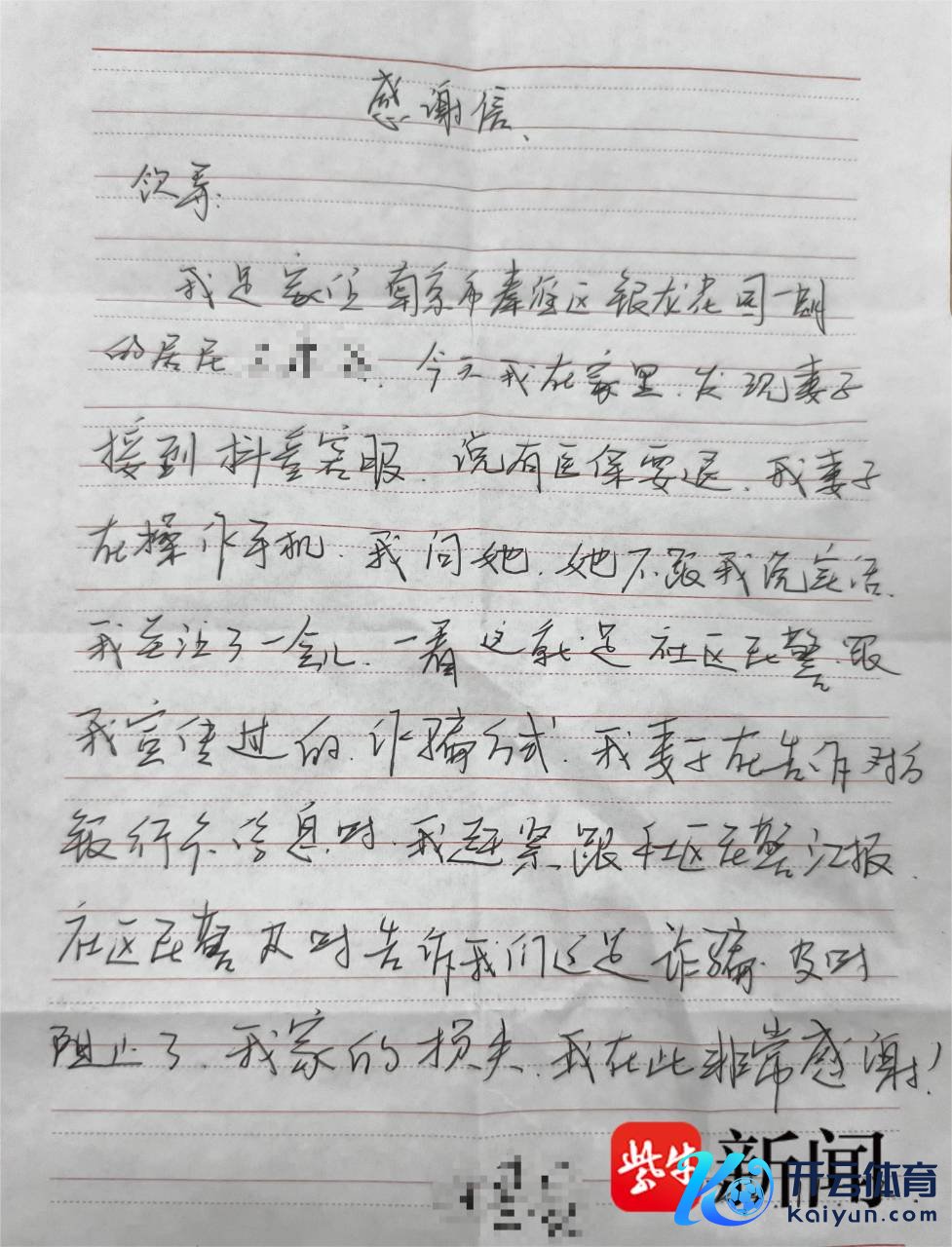扬子晚报网11月18日讯(通信员 秦公轩 曹慧琴 记者 陈勇)近日云开体育,南京秦淮公本分局光华路派出所收到了一封来自辖区王爷爷的亲笔感谢信,信中抒发了王爷爷对民警实时浮松一齐利用案件的谢忱之情。