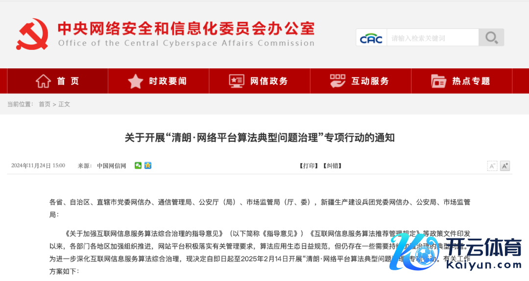 中央汇集安全和信息化委员会办公室通知局、工业和信息化部办公厅、公安部办公厅、国度市集监督料理总局办公厅发布《对于开展“晴明·汇集平台算法典型问题治理”专项行动的示知》云开体育,执行如下:
