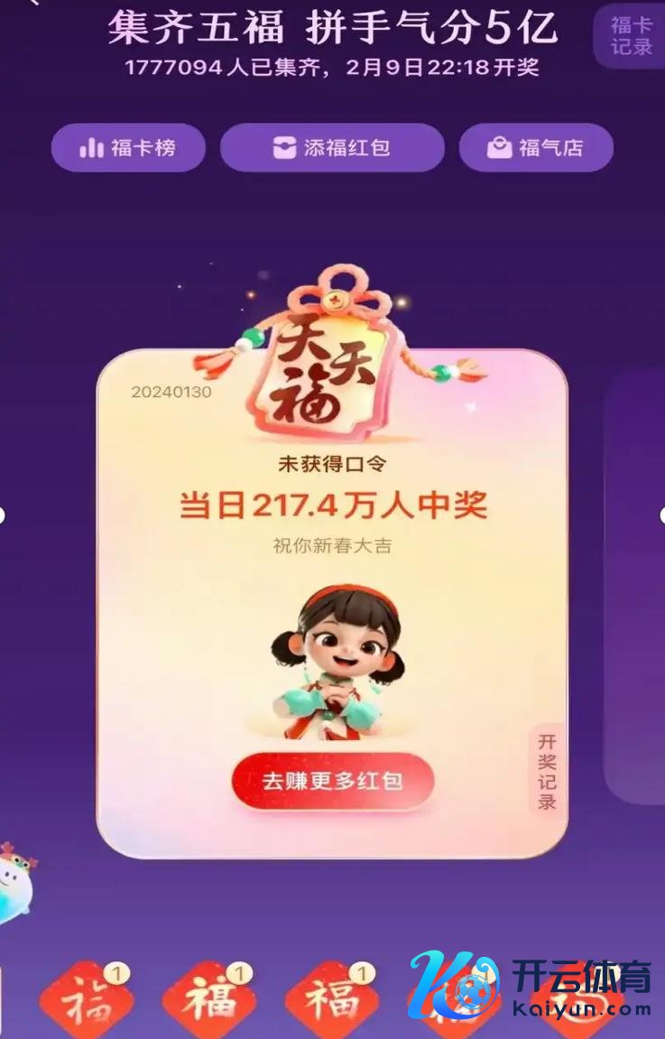 2016年,阿里支付宝不吝重金砸向春晚,2.69亿元打败了微信,用一场集五福活动见效找回了场子。2016年除夜夜,支付宝互动平台的总参与次数达到了3245亿次,是2015年春晚互动次数的29.5倍。在21点09分,互动更是达到了峰值210亿/分钟,致使一度导致做事器宕机。
