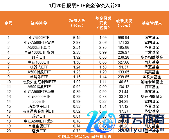 具体来看,1月20日共有10只ETF资金净流入超1亿元。其中,南边基金的中证500ETF净流出6.15亿元,富国基金的中证A500ETF富国、中原基金的A500ETF基金净流入金额分袂为2.97亿元、2.51亿元。