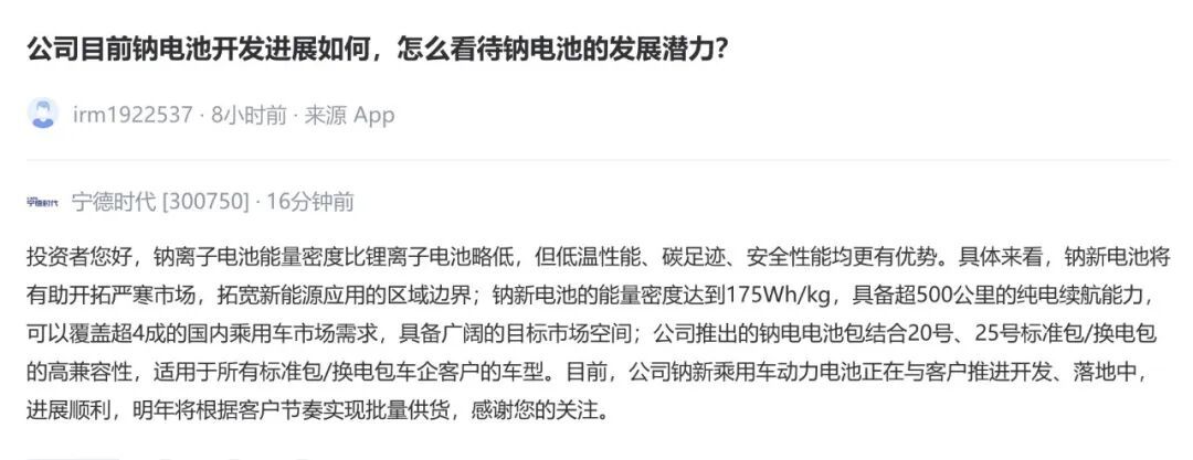9月17日晚间,有投资者在互动平台向宁德时期发问:公司现在钠电板建树发扬若何,奈何看待钠电板的发展后劲?